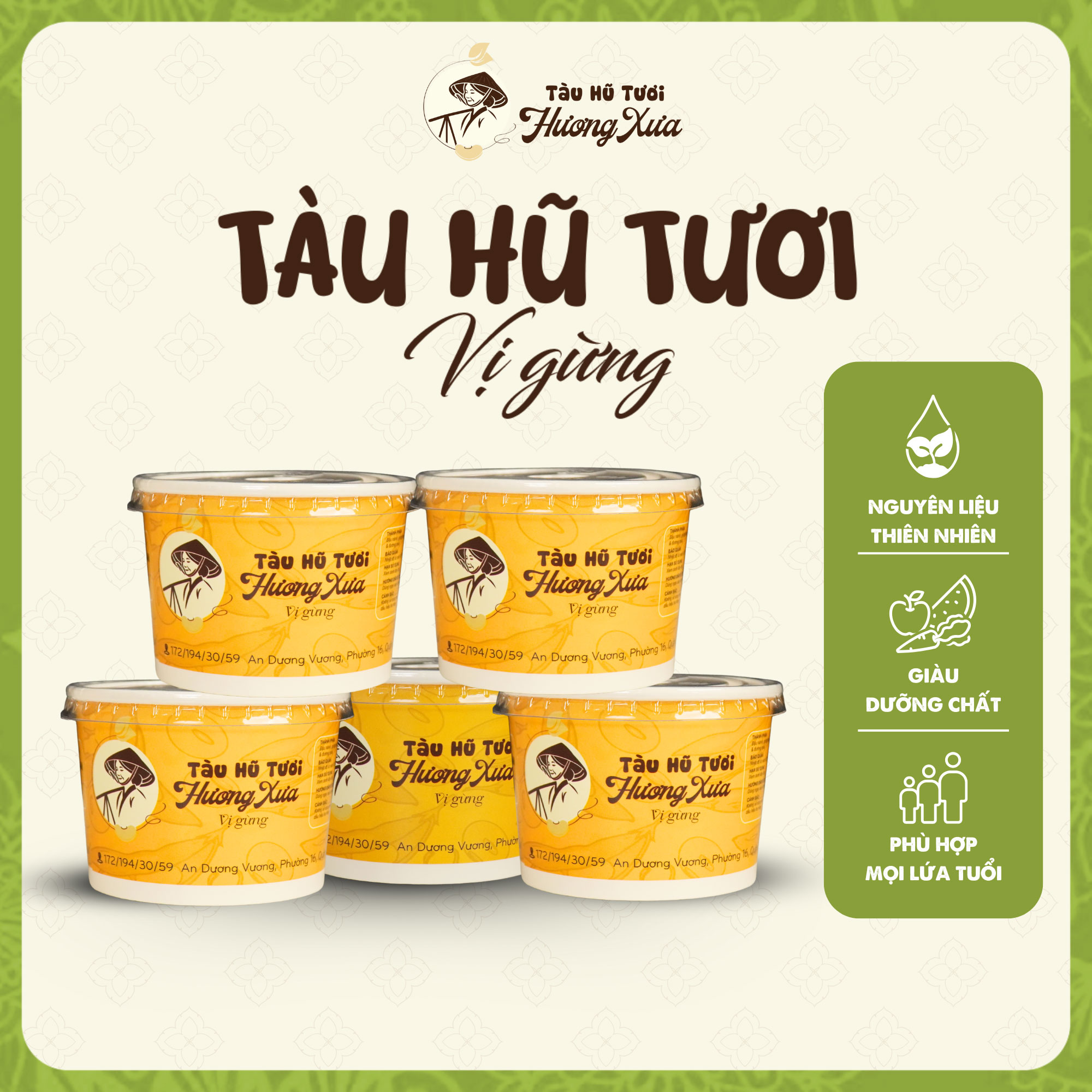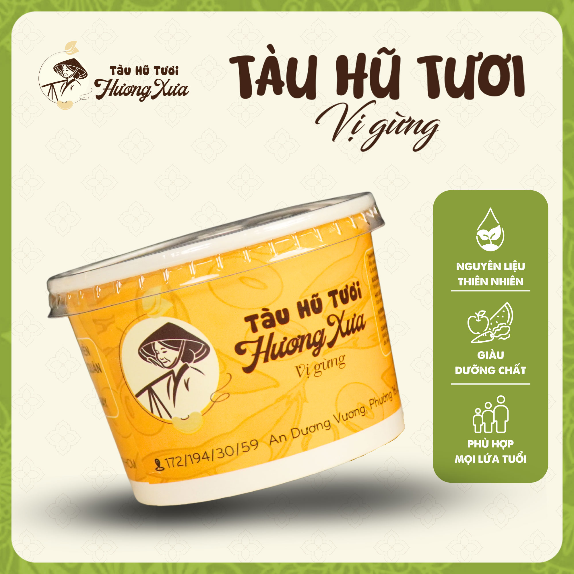 Chế biến từ những nguyên liệu tự nhiên như đậu nành tươi, gừng tươi, đường mía, gừng tươi và bột đông tự nhiên từ tảo biển. Tàu hũ tươi vị gừng không chỉ mang lại hương vị thơm ngon mà còn bổ sung nhiều dưỡng chất tốt cho sức khoẻ. Sự kết hợp tinh tế giữa vị ngọt thanh của tàu hũ tươi và hương thơm đặc trưng của gừng tạo nên trải nghiệm ẩm thực độc đáo.